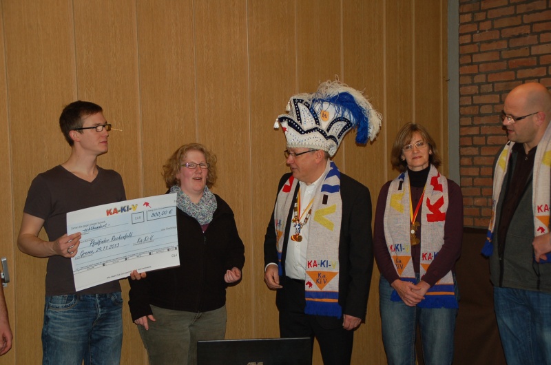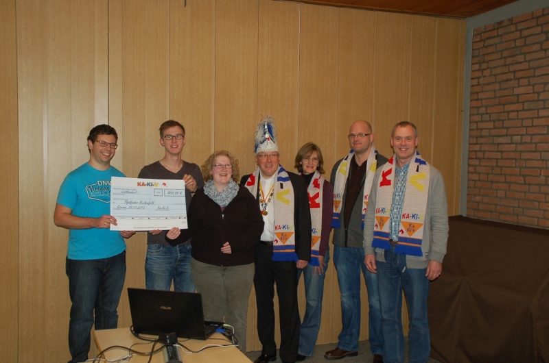 Am 01. Dezember 2013 trafen sich aus diesem Grund das Prinzenpaar Wilfried und Heidi zusammen mit dem KaKiV Präsidenten Dirk und Christoph mit Christine Deitmar, Philipp Heming und Stephan Kochmann von den Pfadfindern. Mit großer Freude konnten wir den Betrag von 800 € überreichen. Mit diesem Geld soll vor allem der Traktor in Stand gesetzt werden, der sowohl bei Pfadi-Events (wie der Tannenbaum-Sammelaktion) als auch als "Zugpferd" für die Karnevalswagen der KaKiV zum Einsatz kommt.